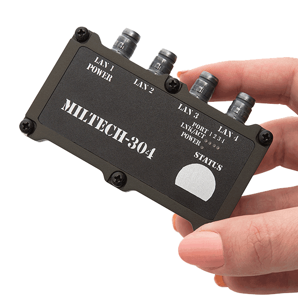 Leveraging best-in-class switching technology, the MILTECH 304 serves as a robust commercial off-the-shelf (COTS) solution for rugged LAN connectivity in SPaW sensative platforms such as command post, man packable, and UAV systems.