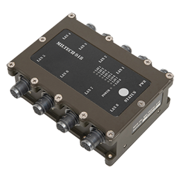 The MILTECH 918 is an 8 port ethernet switch which can be remotely managed to deliver Layer 2 switching to optimize on-vehicle communications traffic prioritization between IP-based devices such as communication and navigation systems, sensors, video cameras and targeting systems.