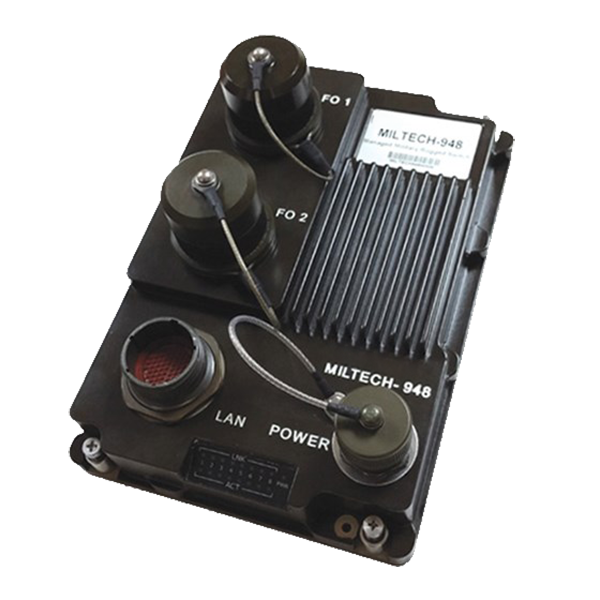 The MILTECH 948 is a rugged fully managed military-grade Ethernet switch combined with media convertesion capabilities. It offers 8 triple-speed (10/100/1000Mbps) ports and the option of two fiber port operating at either 100Mbps or 1Gbps.